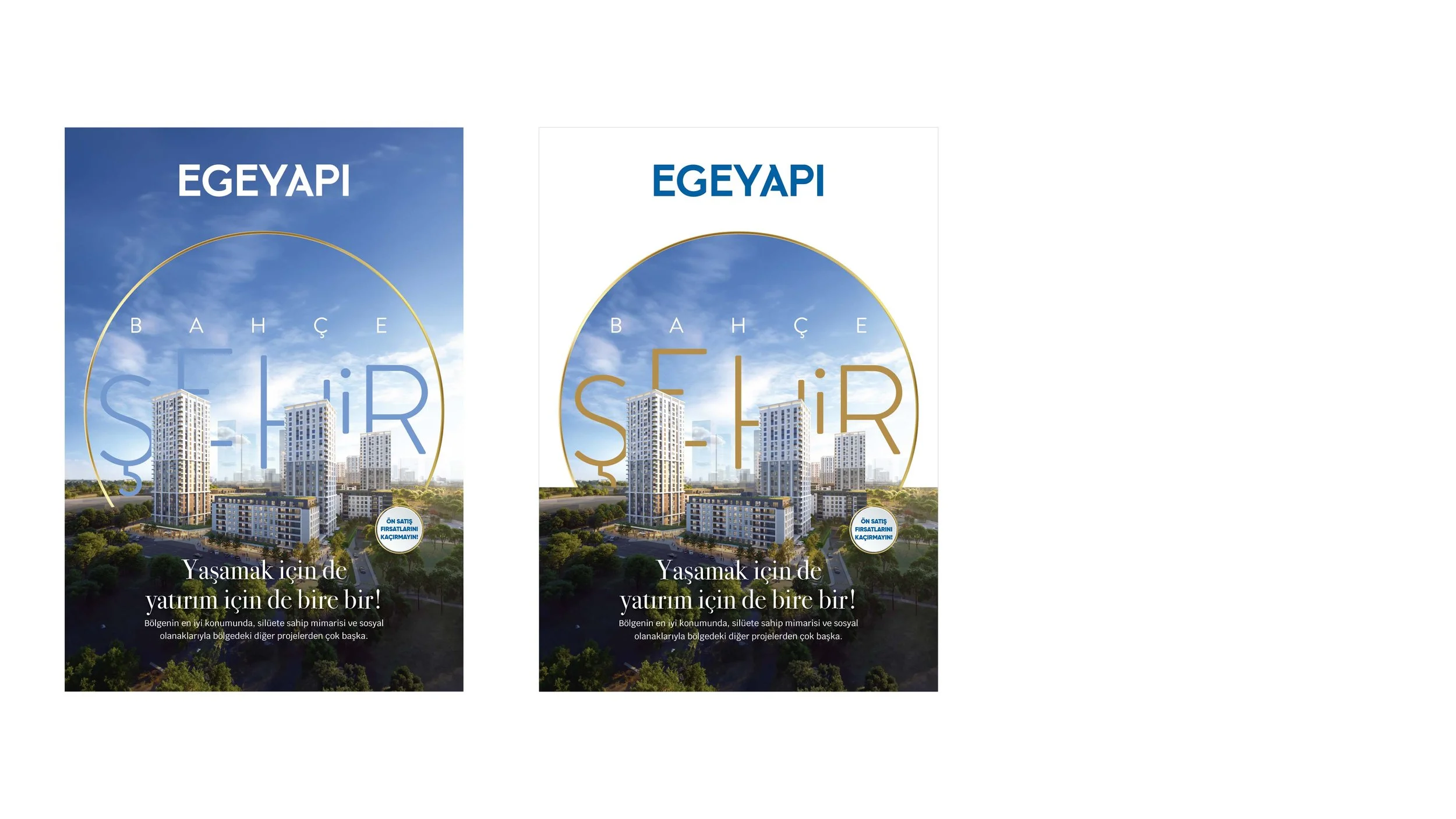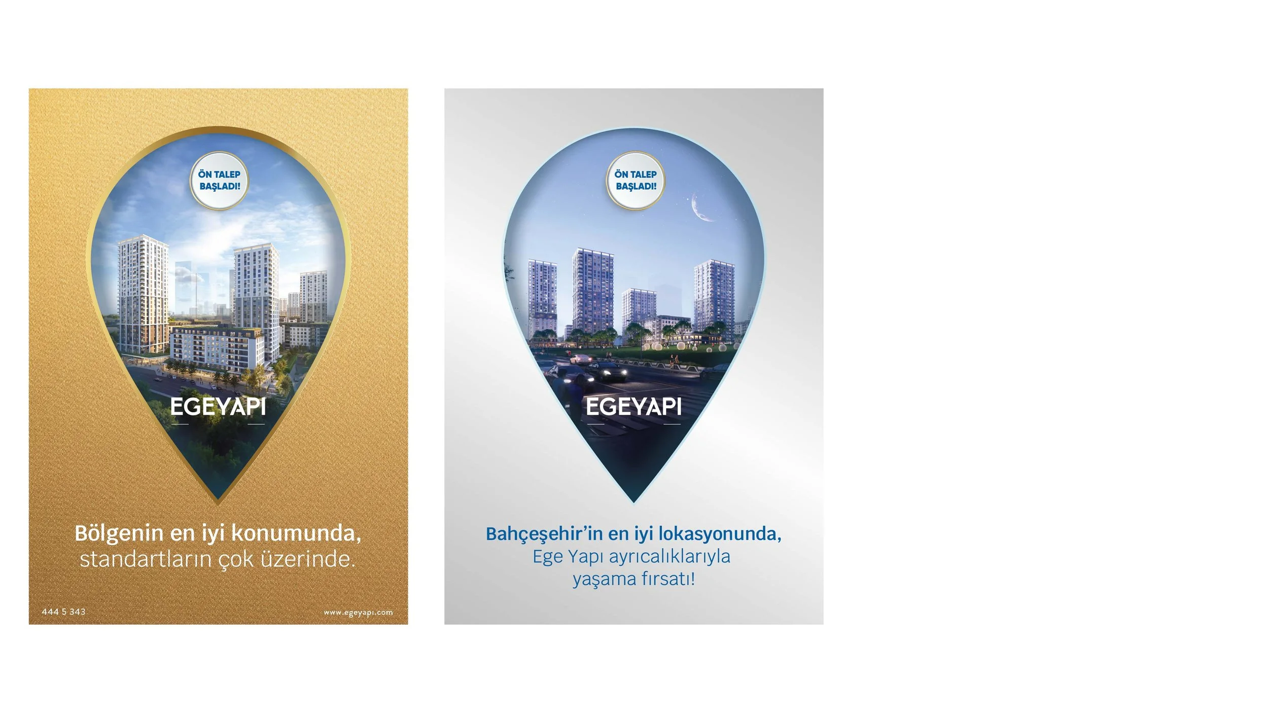 Two promotional banners for Ege Yapı real estate project. The left banner has a gold background with a cityscape inside a location pin, and text in Turkish promoting the region's high standards. The right banner has a silver background with a citysca