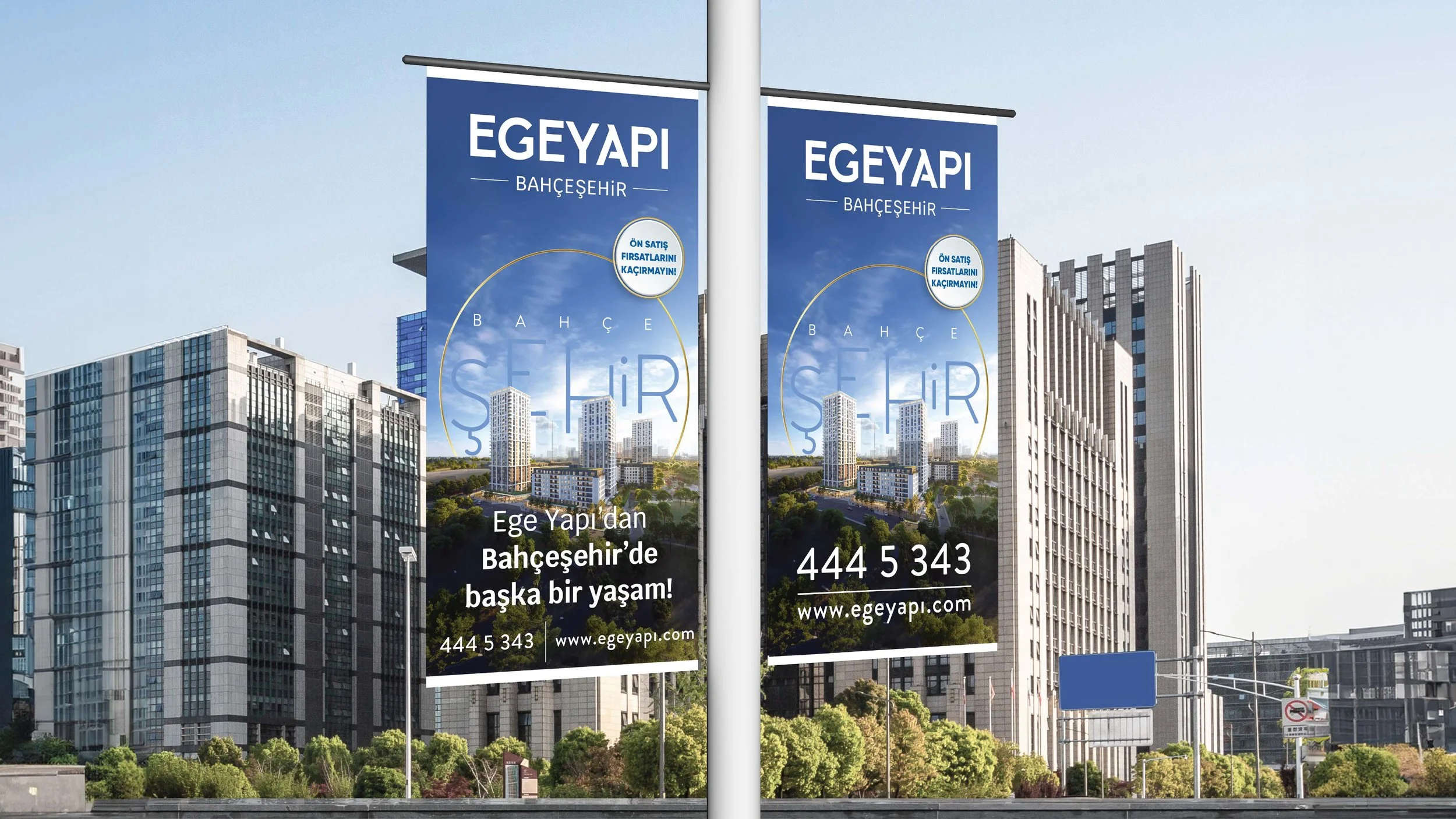 Two vertical banners advertising Ege Yapı, a real estate development company, with images of modern buildings and greenery, placed on a city street against a background of high-rise office buildings.