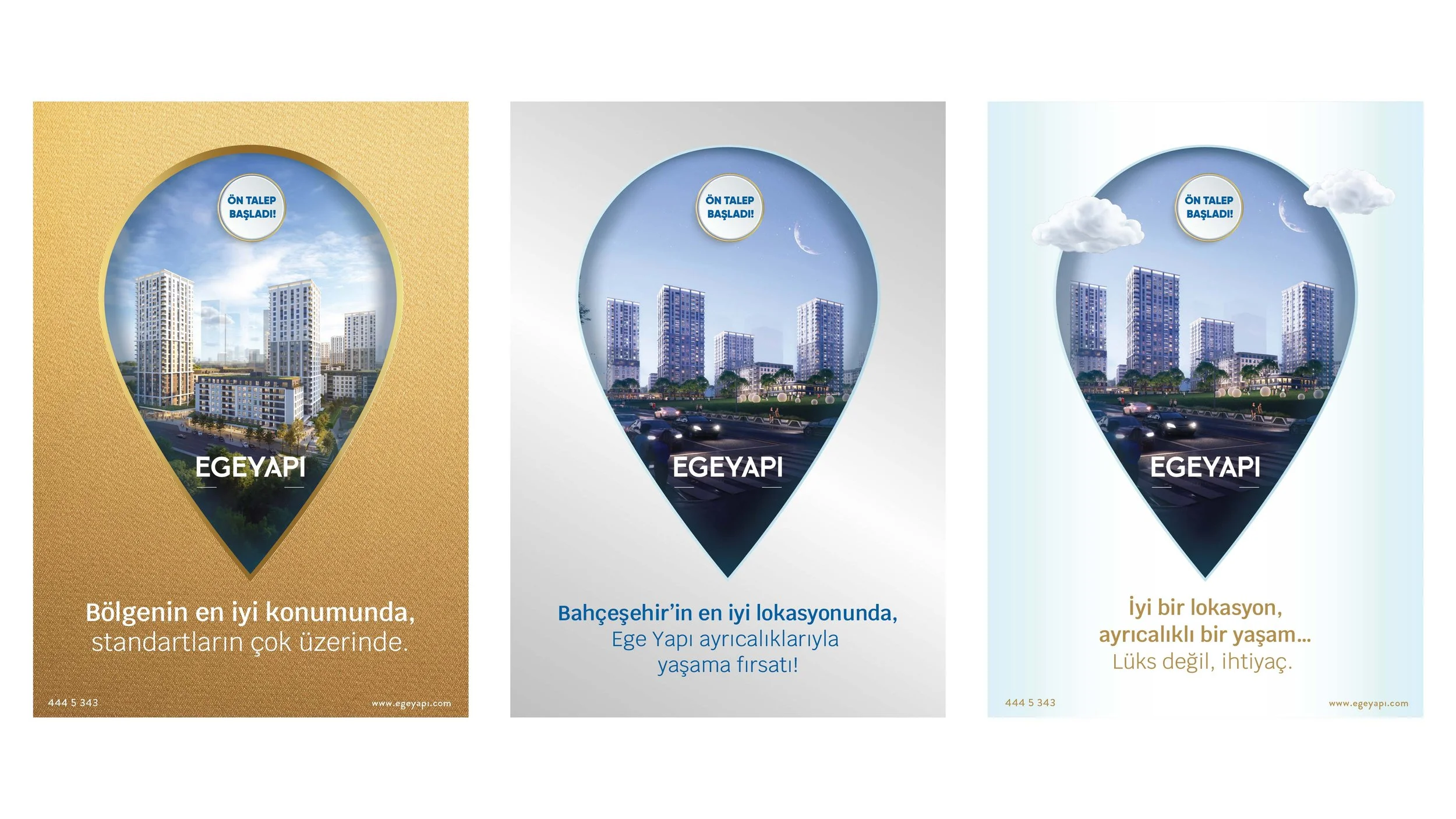 Three different promotional advertisements for Ege Yapı, showcasing modern high-rise buildings with varied background designs and color schemes including gold, grey, and light blue.