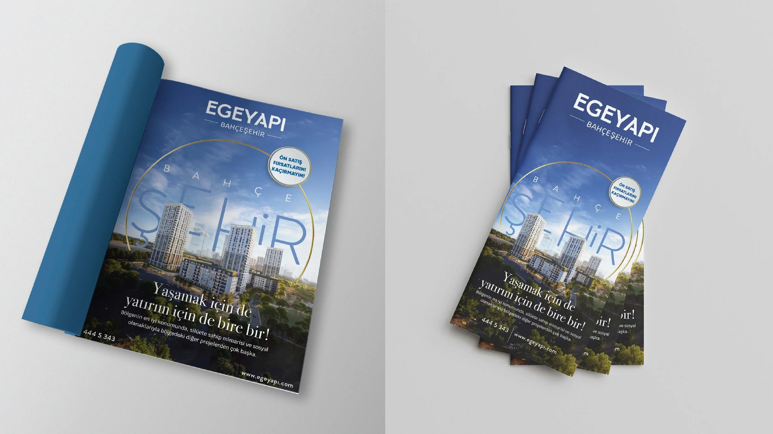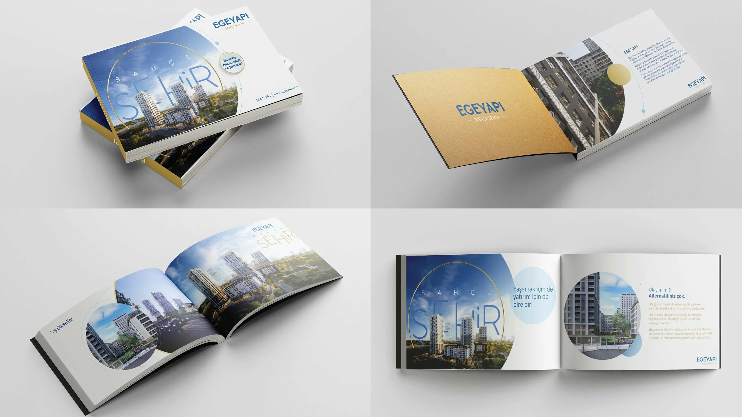 A brochure promoting Bahçe Şehir, a real estate project by Egeyap, featuring images of modern residential buildings and cityscapes, with informational text and design elements in blue and white.