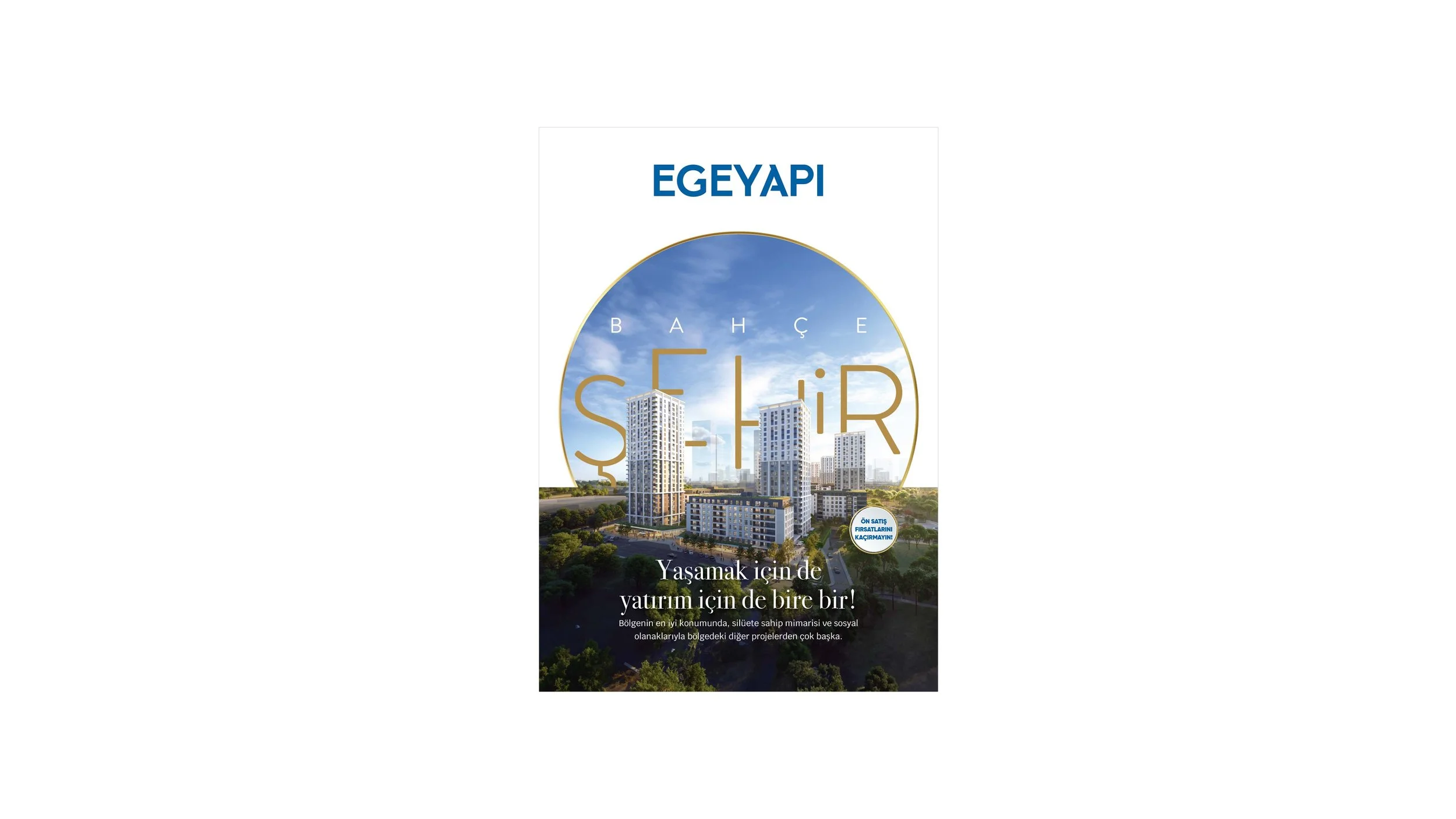 Flyer for Egeyapı Bahçeşehir showing a cityscape with tall buildings and green trees, featuring blue sky and white clouds, advertising real estate investment opportunities.
