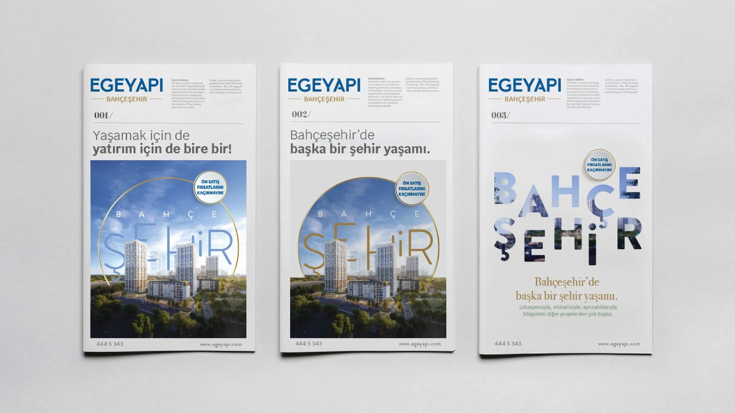 Three brochures for a real estate project called Bahçeşehir. The brochures feature images of modern buildings and trees, with the title 'Egeyapi Bahçeşehir' and subtitles about city living and investment opportunities.