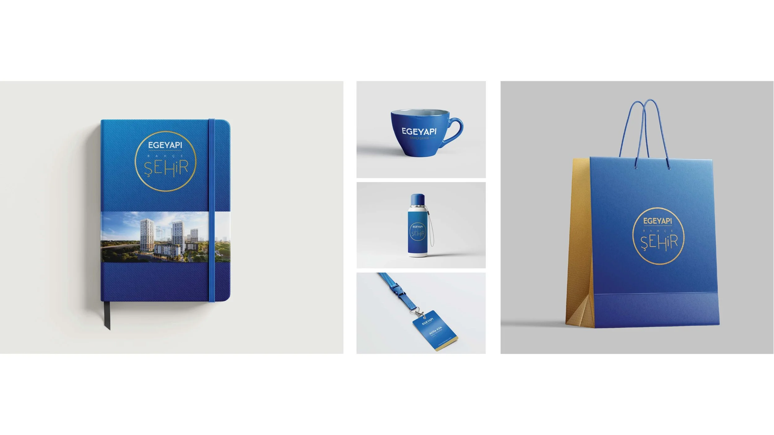 Blue branded notebook with an urban cityscape photo, blue mug, blue water bottle with logo, blue lanyard with ID badge, and a blue shopping bag with logo.