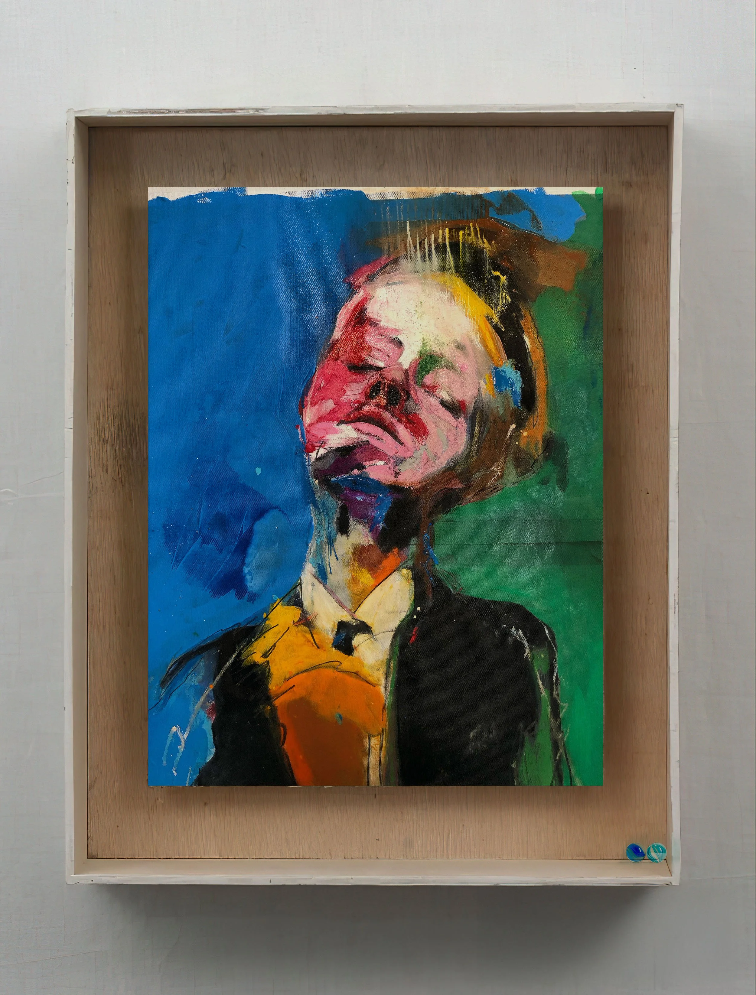 An abstract portrait painting of a person with closed eyes, wearing a black suit and orange shirt, with a multi-colored background of blue, green, and brown.