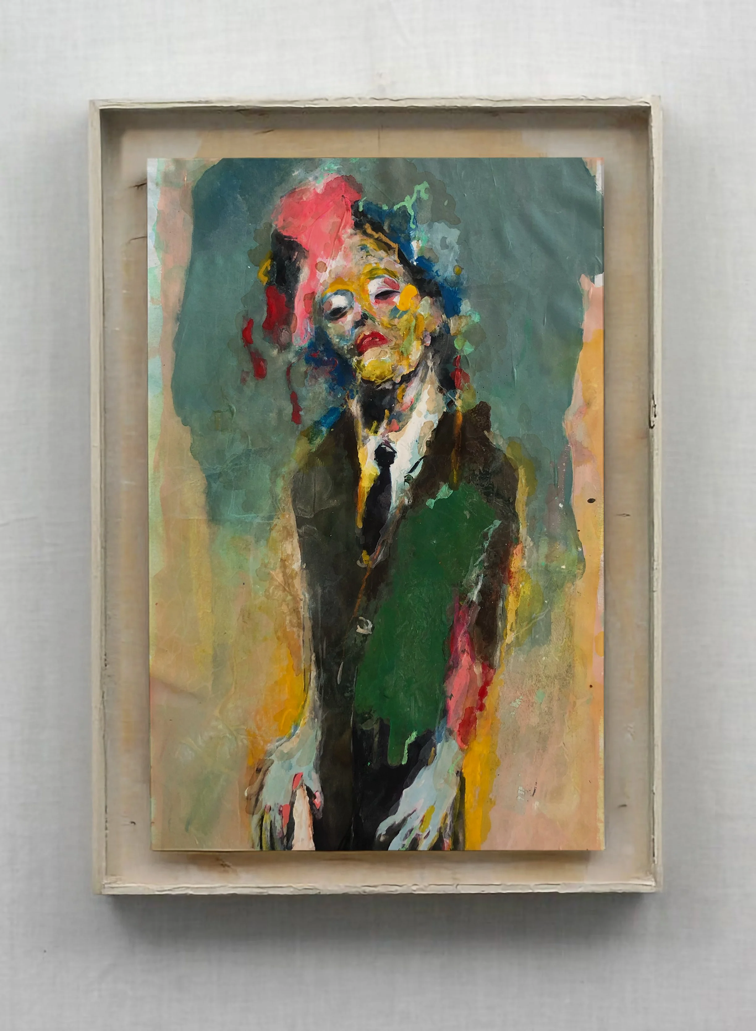 An abstract oil painting of a person in a suit and tie with exaggerated colorful brushstrokes, featuring expressive facial features and vibrant colors. View fullsize