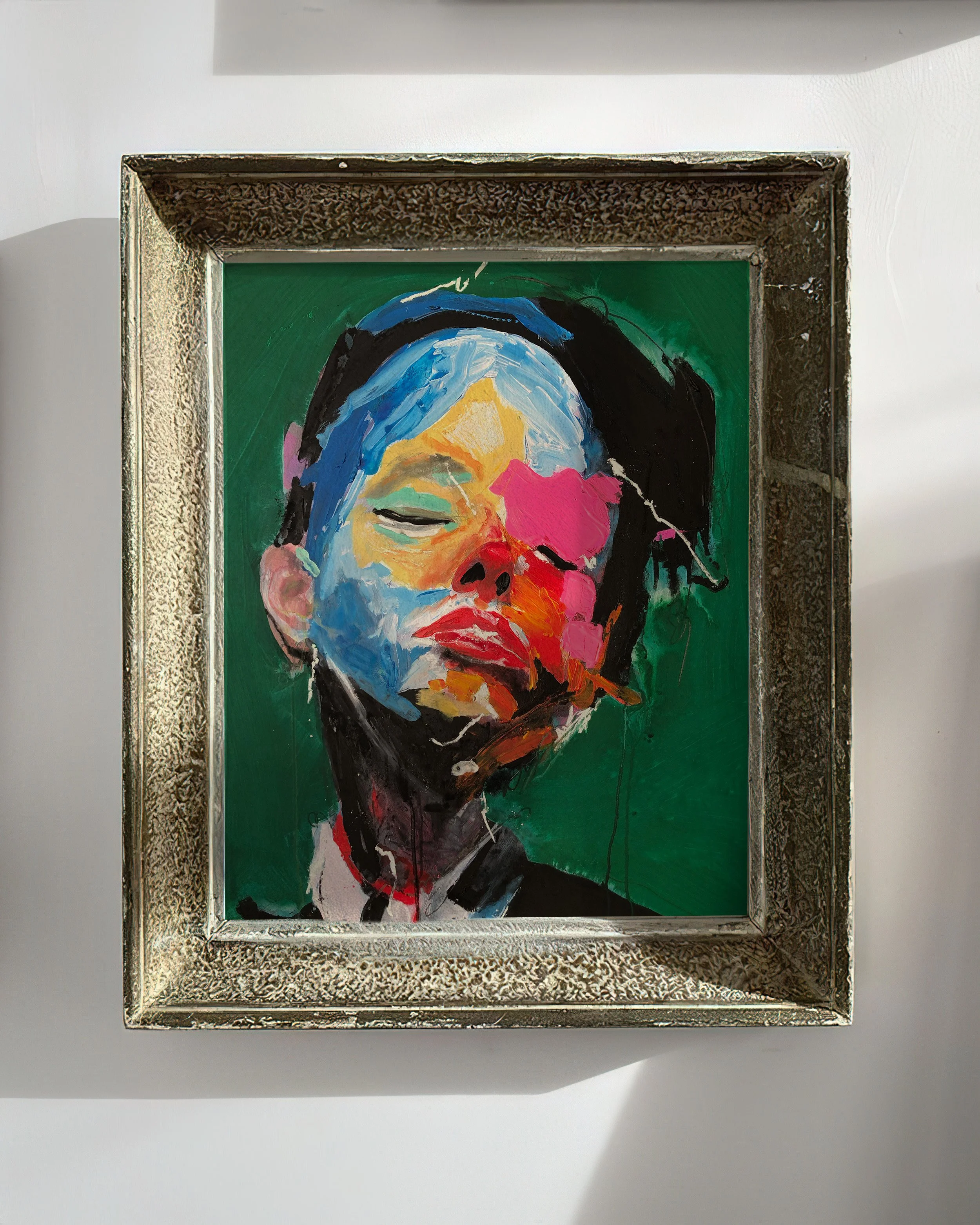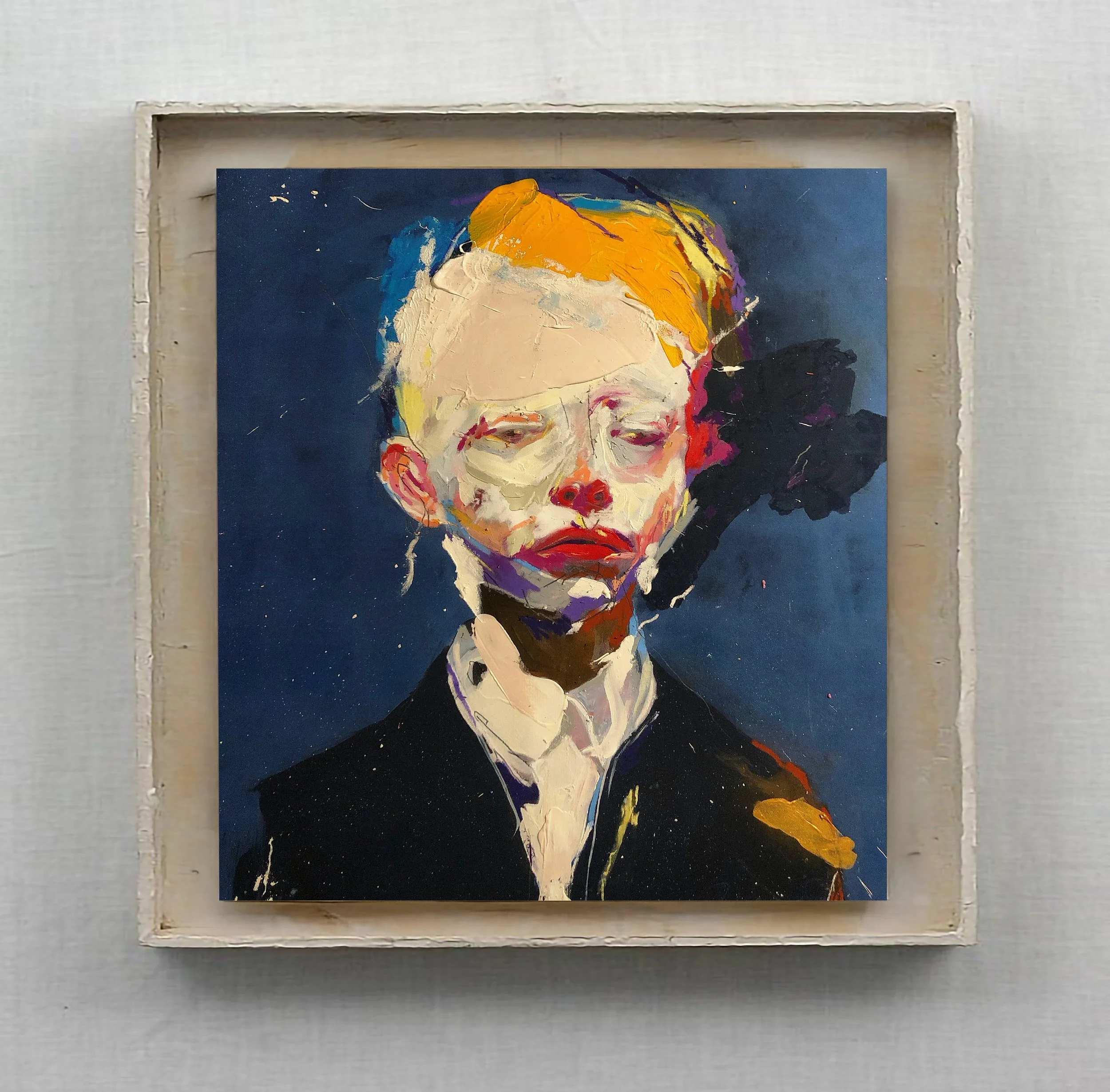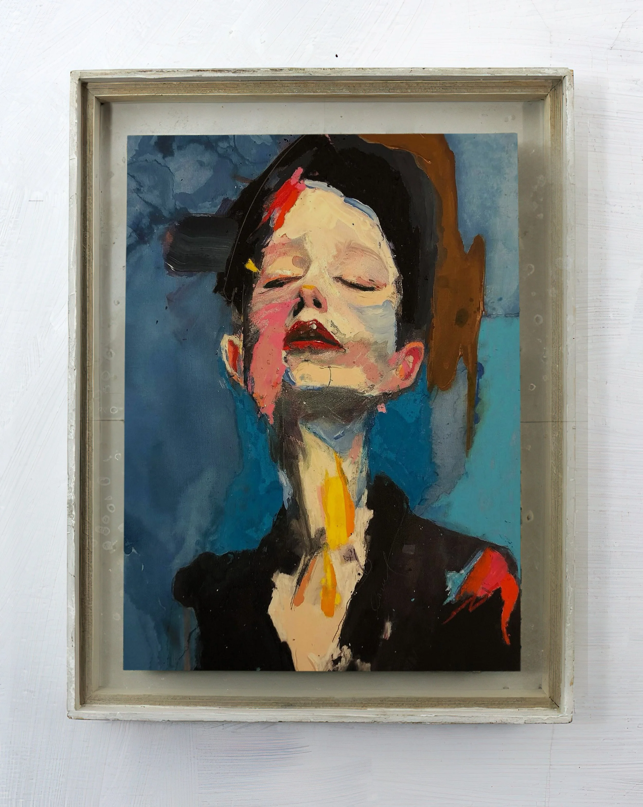 Abstract portrait of a woman with closed eyes, painted in bold, expressive brushstrokes with a dark blue background, encased in a wooden frame.