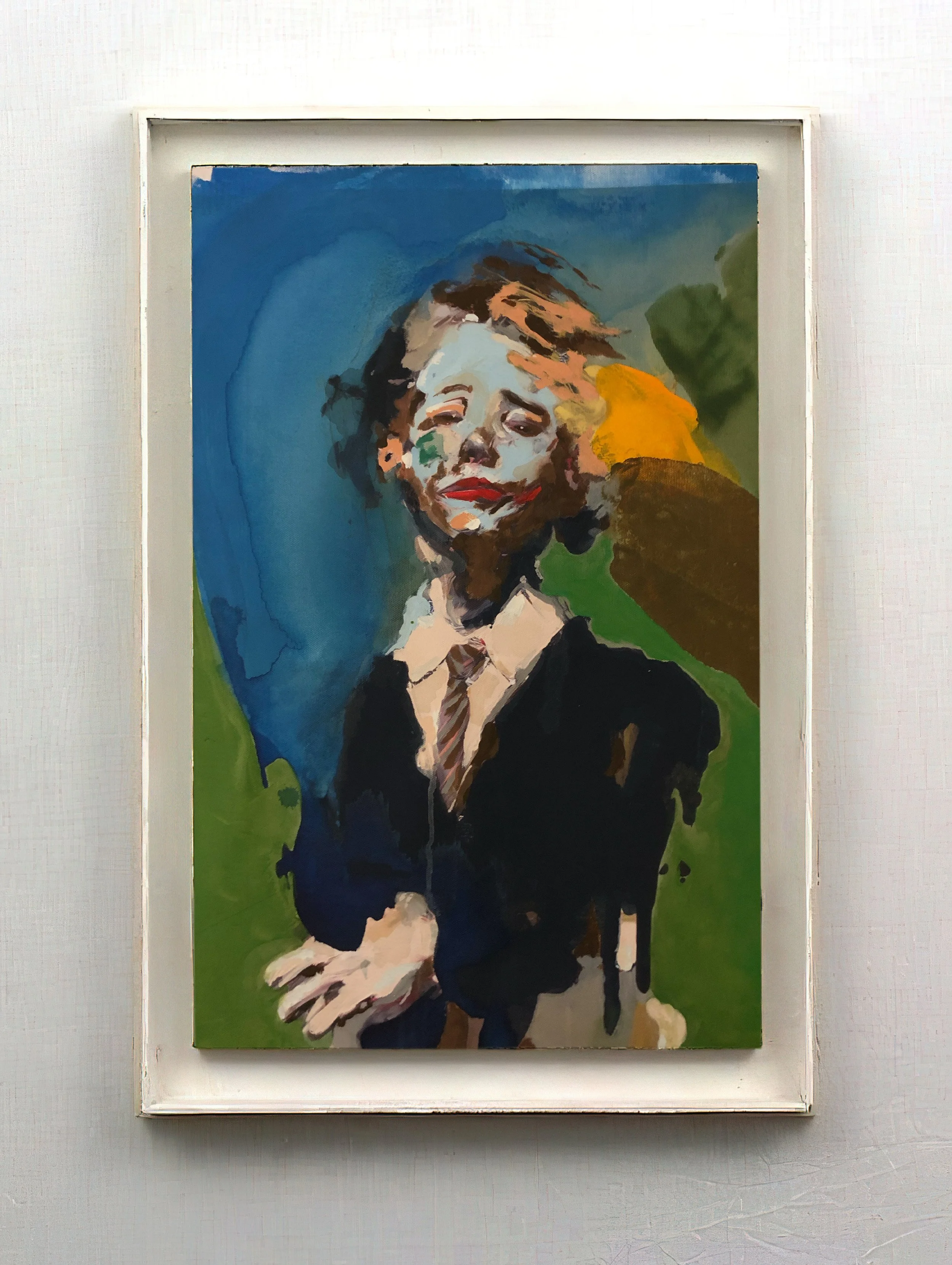 Abstract portrait of a man with blond hair, wearing a suit and tie, painted with bold brushstrokes and vibrant colors, mounted in a white frame against a light-colored wall. View fullsize